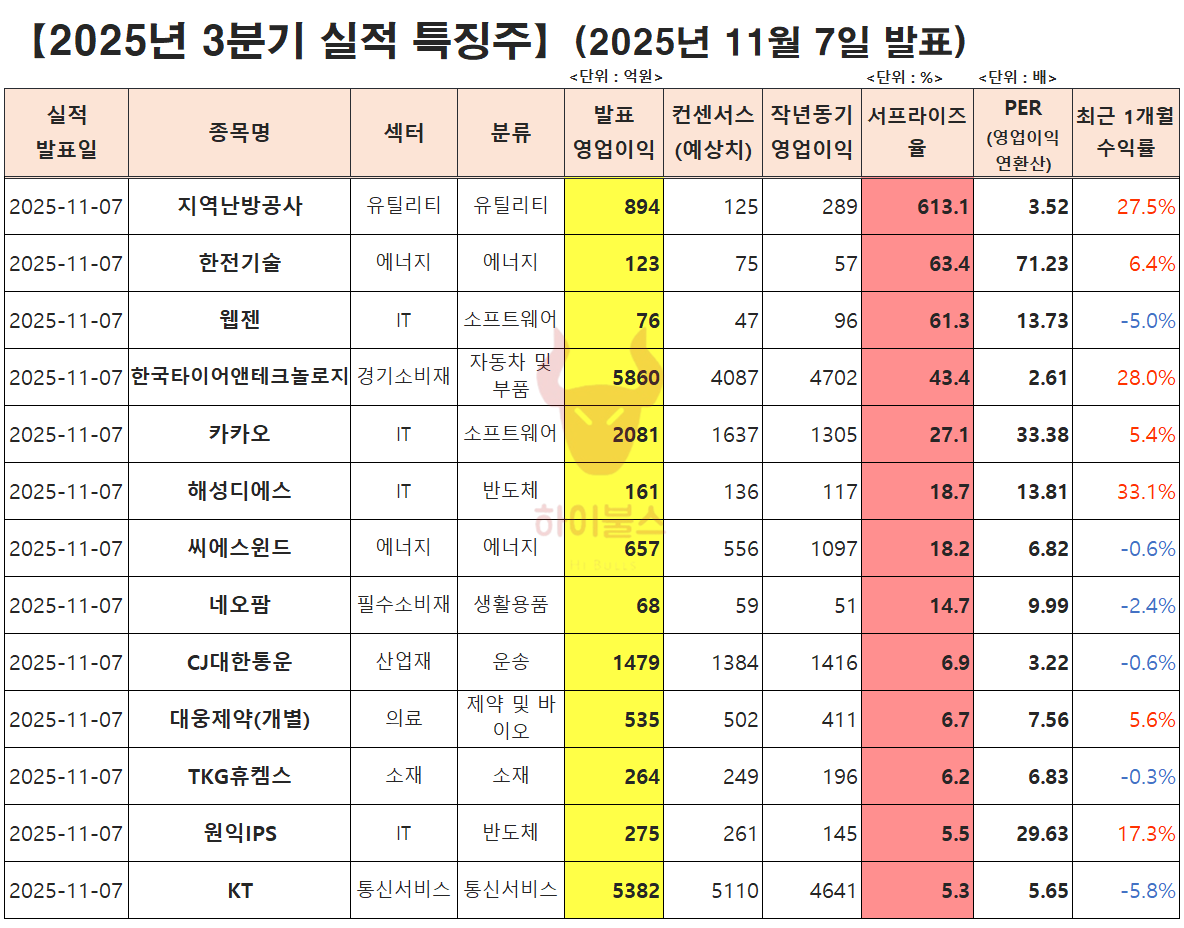 실적 서프라이즈 : 지역난방공사, 한전기술, 웹젠, 한국타이어앤테크놀로지, 카카오, 해성디에스, 씨에스윈드, 네오팜