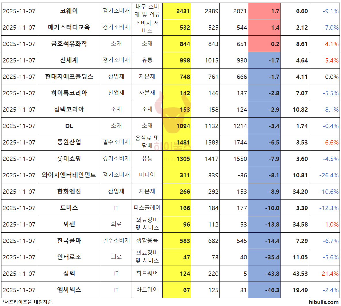 실적 미스 : 동원산업, 롯데쇼핑, 와이지엔터테인먼트, 한화엔진, 토비스, 씨젠, 한국콜마