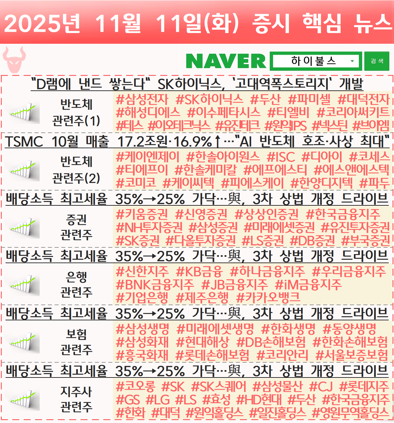 반도체 관련주, 증권 관련주, 은행 관련주, 보험 관련주, 지주사 관련주, 상법 개정 관련주, 배당소득 분리과세 관련주 글 내비게이션 [11.10] 증시 개장 전 핵심뉴스 하이불스 Pick [11.12] 증시 개장 전 핵심뉴스 하이불스 Pick