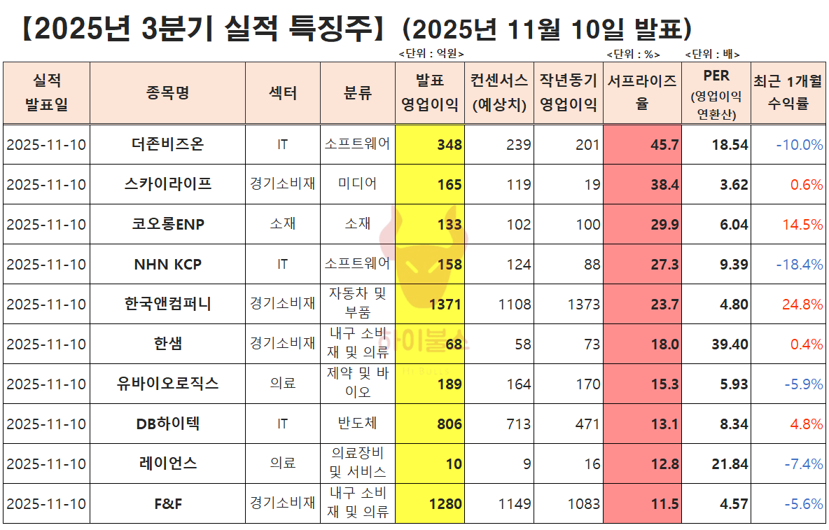 실적 서프라이즈 : 더존비즈온, 스카이라이프, 코오롱ENP, NHN KCP, 한국앤컴퍼니, 한샘, 유바이오로직스