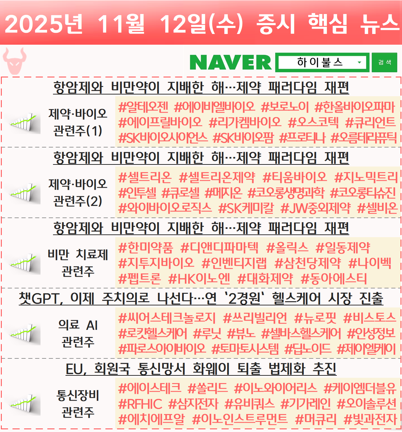 제약 바이오 관련주, 비만약 관련주, 비만 관련주, 비만 치료제 관련주, 비만치료제 관련주, 의료 AI 관련주, 통신장비 관련주 글 내비게이션 [11.11] 증시 개장 전 핵심뉴스 하이불스 Pick [11.13] 증시 개장 전 핵심뉴스 하이불스 Pick