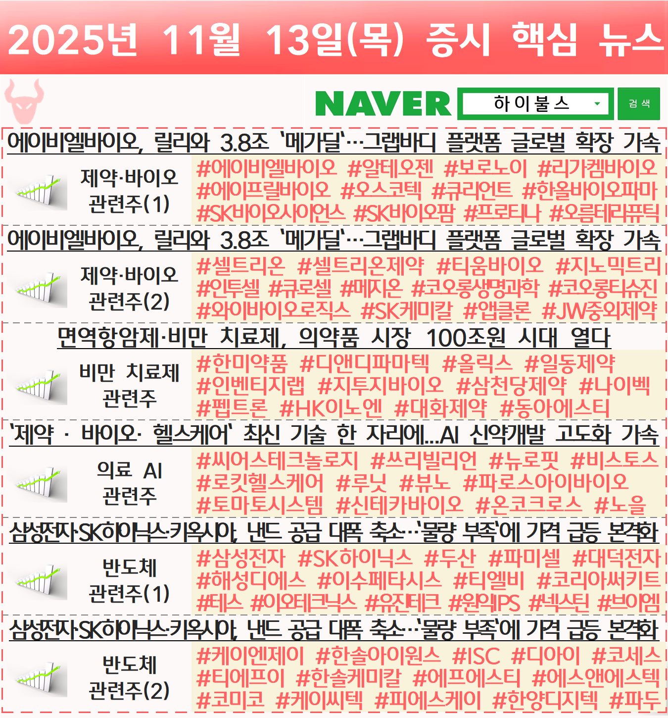 제약 바이오 관련주, 비만 치료제 관련주, 비만약 관련주, 비만 관련주, 비만치료제 관련주, 의료 AI 관련주, 반도체 관련주 글 내비게이션 [11.12] 증시 개장 전 핵심뉴스 하이불스 Pick [11.14] 증시 개장 전 핵심뉴스 하이불스 Pick