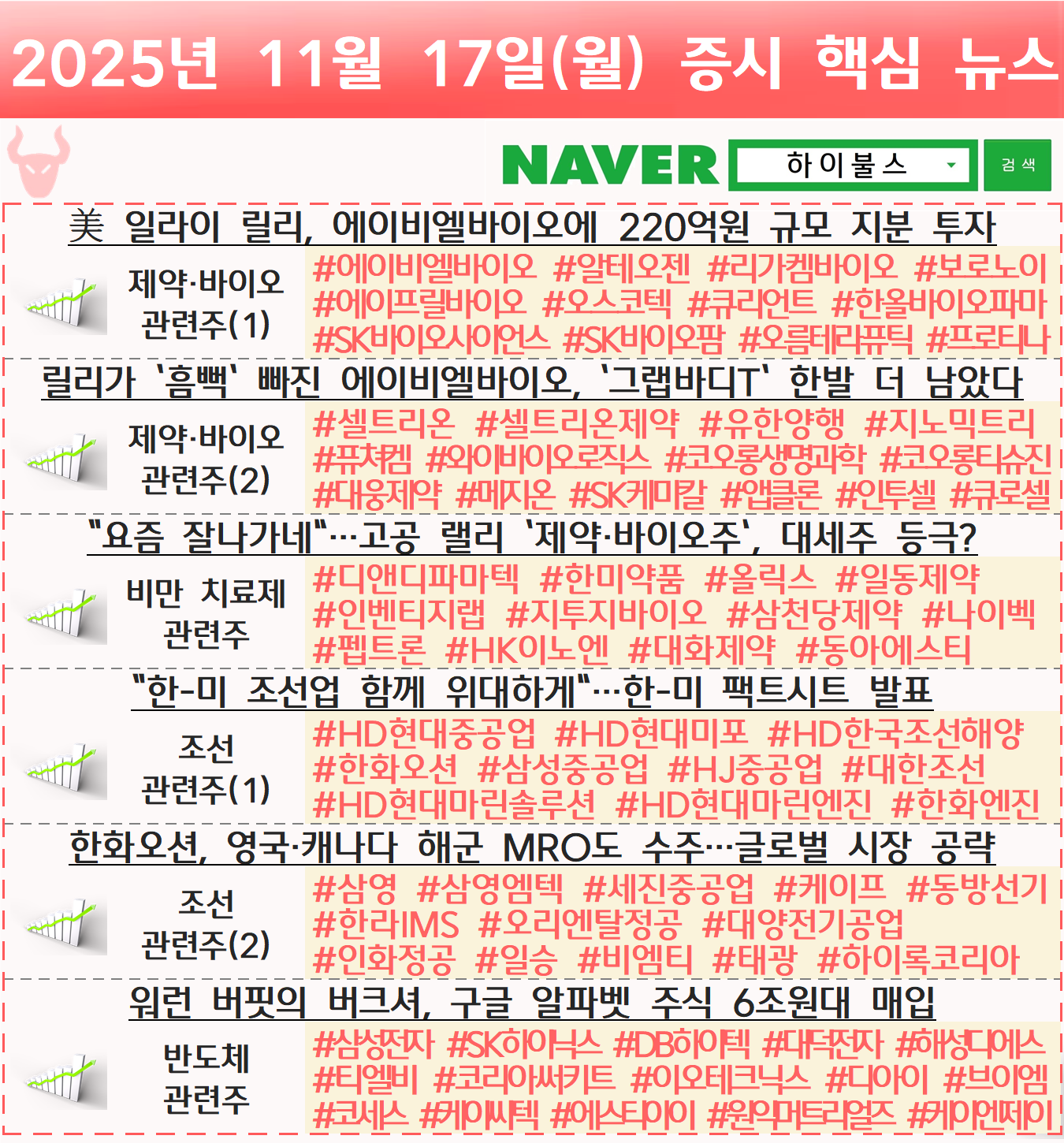 제약 바이오 관련주, 비만 관련주, 비만약 관련주, 비만 치료제 관련주, 비만치료제 관련주, 조선 관련주, MASGA 관련주, 반도체 관련주 글 내비게이션 [11.14] 증시 개장 전 핵심뉴스 하이불스 Pick [11.18] 증시 개장 전 핵심뉴스 하이불스 Pick