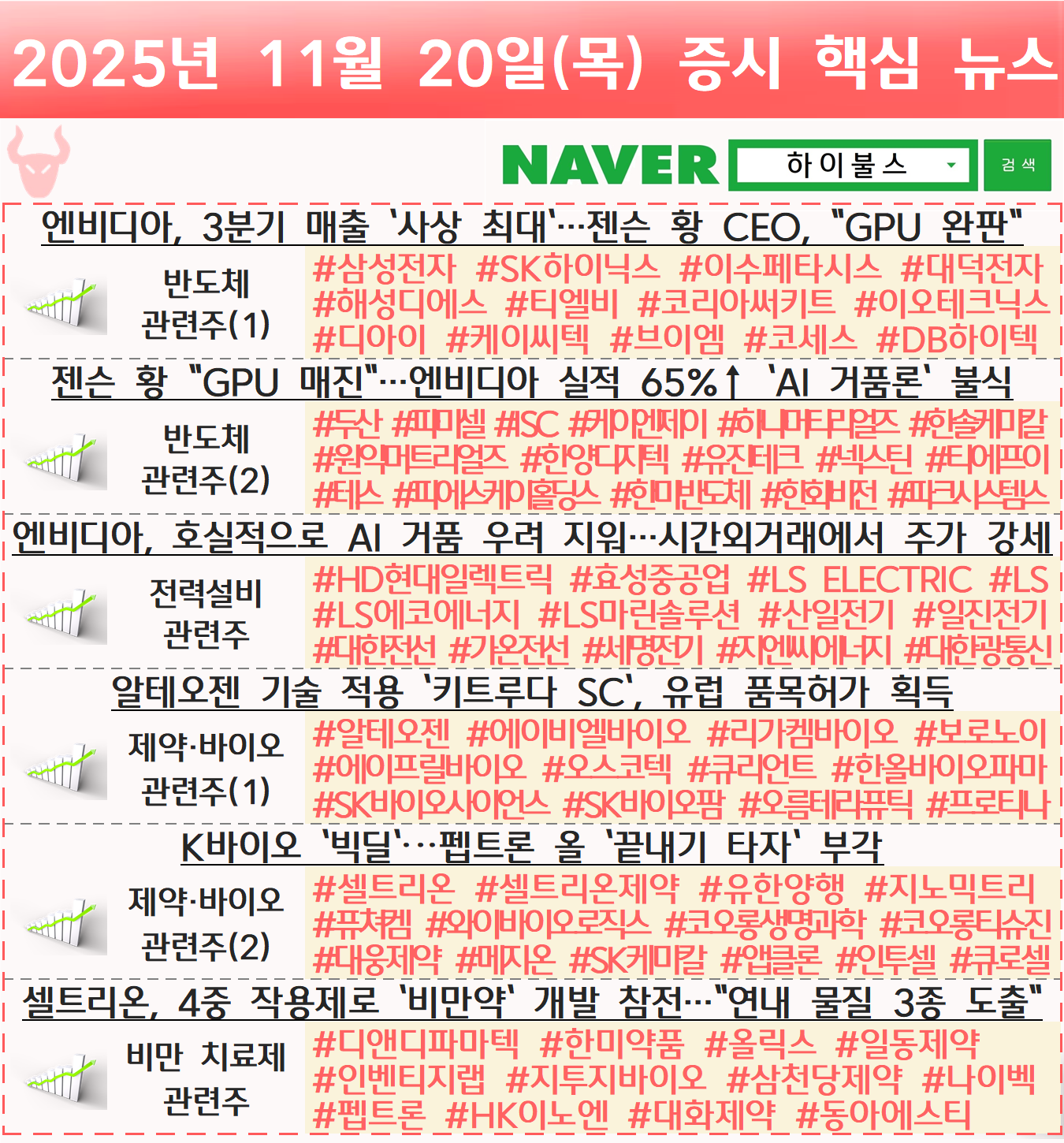 반도체 관련주, 전력망 관련주, 전력설비 관련주, 전력기기 관련주, 제약 바이오 관련주, 비만 관련주, 비만약 관련주, 비만치료제 관련주, 비만 치료제 관련주 글 내비게이션 [11.19] 증시 개장 전 핵심뉴스 하이불스 Pick [11.21] 증시 개장 전 핵심뉴스 하이불스 Pick
