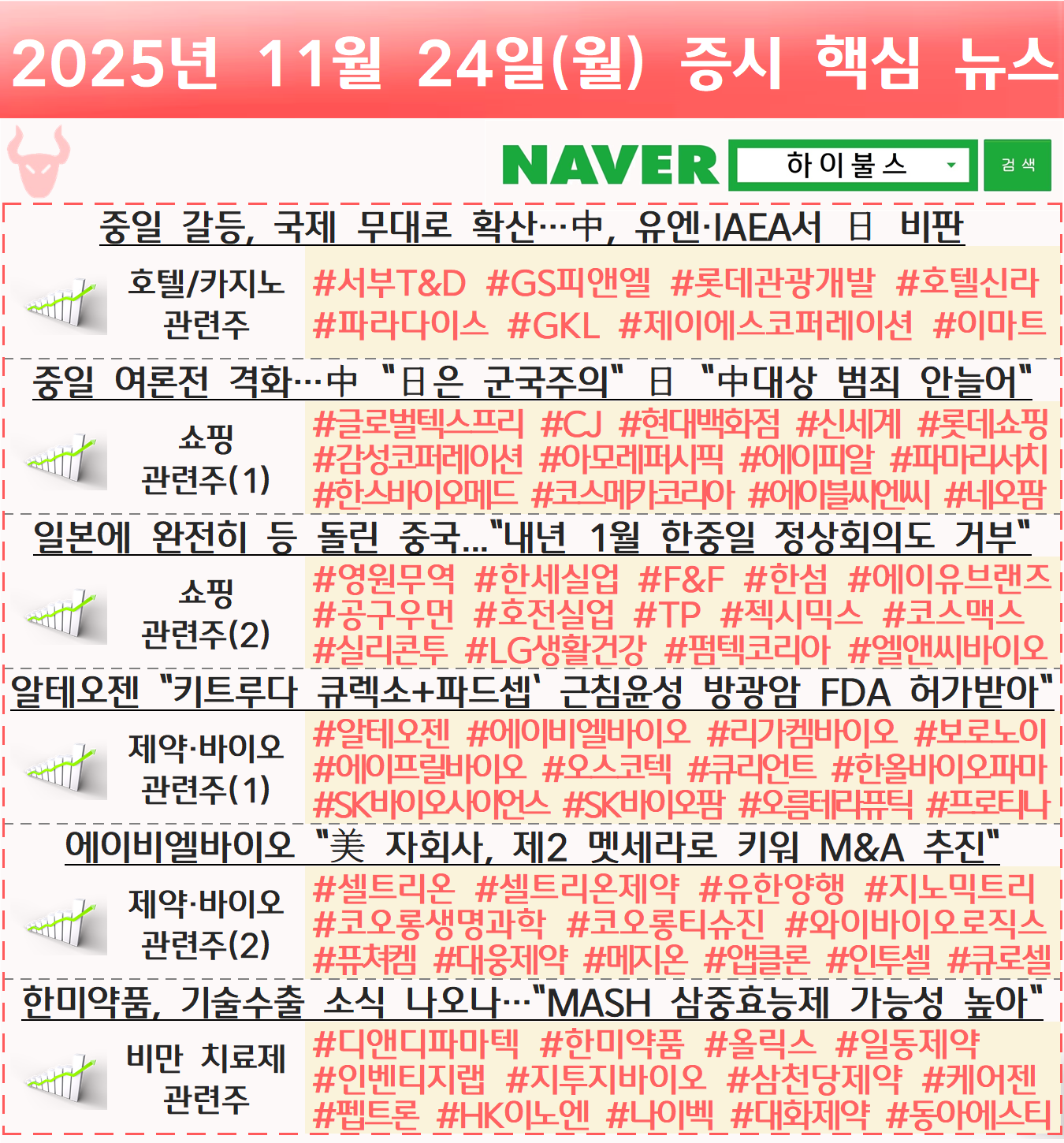 호텔 관련주, 카지노 관련주, 한일령 관련주, 한일령 수혜주, 쇼핑 관련주, 제약 바이오 관련주, 비만 관련주, 비만약 관련주, 비만 치료제 관련주, 비만치료제 관련주 글 내비게이션 [11.21] 증시 개장 전 핵심뉴스 하이불스 Pick [11.25] 증시 개장 전 핵심뉴스 하이불스 Pick