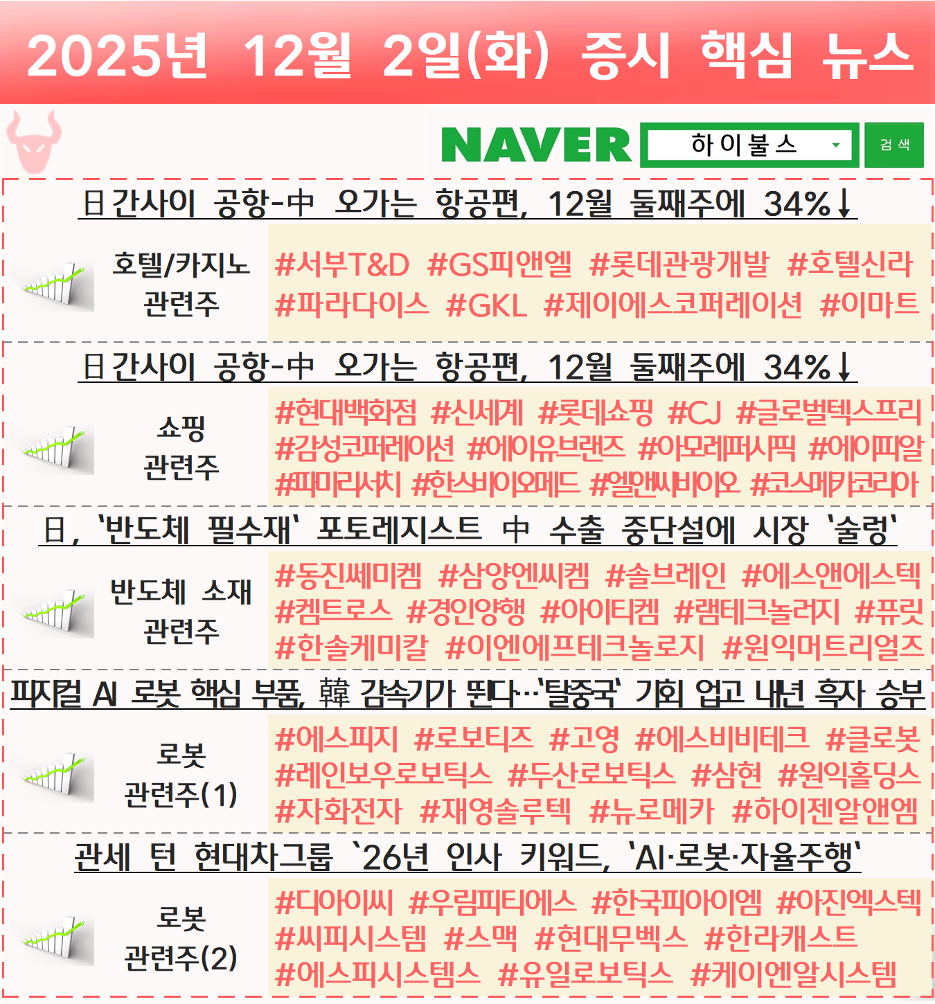 호텔 관련주, 카지노 관련주, 쇼핑 관련주, 관광 관련주, 여행 관련주, 한일령 관련주, 반일령 관련주, 반도체 소재 관련주, 로봇 관련주, 휴머노이드 관련주, 피지컬 AI 관련주