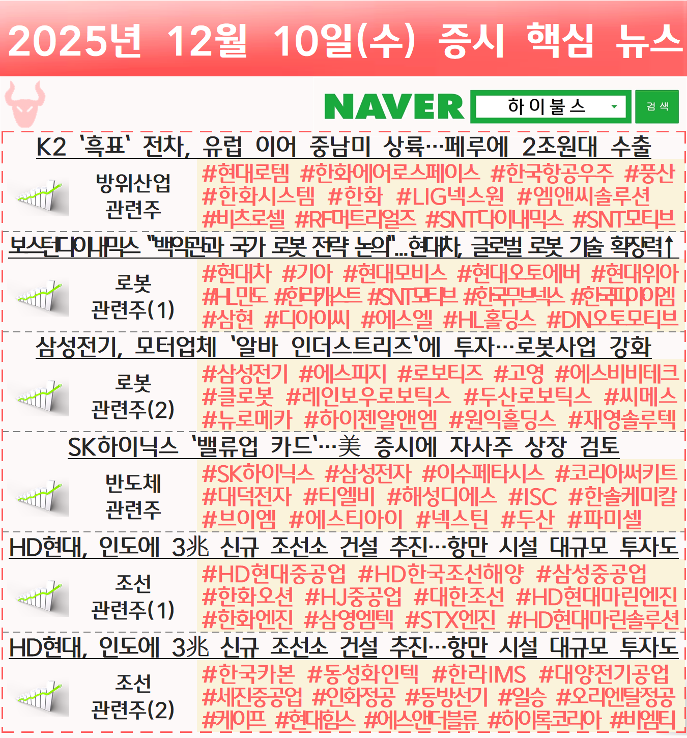 방산 관련주, 방위산업 관련주, 로봇 관련주, 휴머노이드 관련주, 피지컬 AI 관련주, 반도체 관련주, 조선 관련주, MASGA 관련주 글 내비게이션 [12.09] 증시 개장 전 핵심뉴스 하이불스 Pick