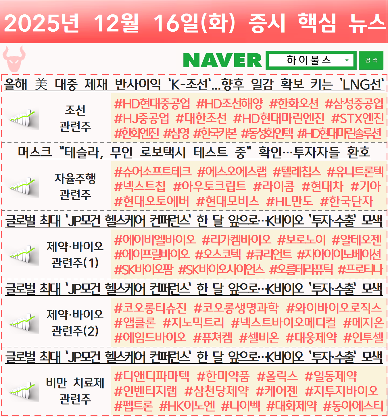 조선 관련주, MASGA 관련주, 자율주행 관련주, 로보택시 관련주, 제약 바이오 관련주, 비만 관련주, 비만약 관련주, 비만치료제 관련주, 비만 치료제 관련주 글 내비게이션 [12.15] 증시 개장 전 핵심뉴스 하이불스 Pick