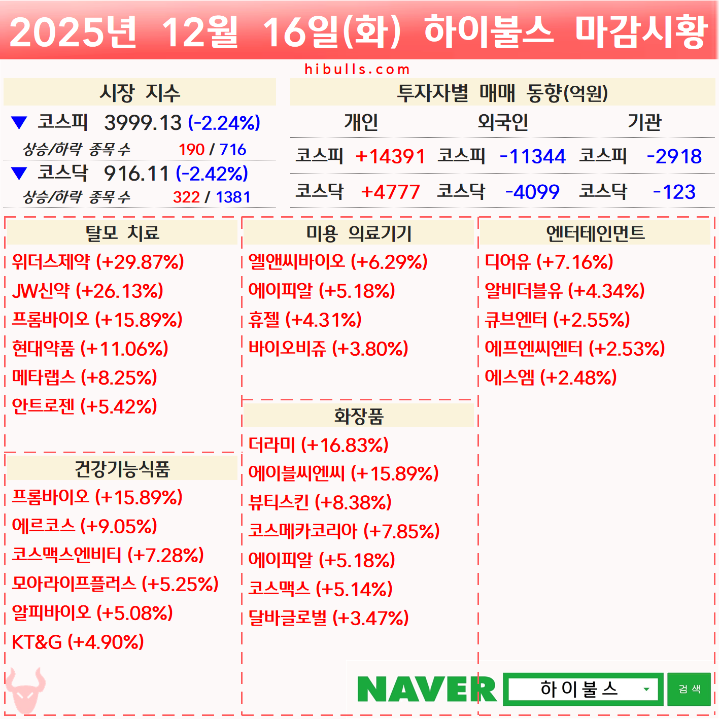 [12.16] 증시 마감시황 및 오늘의 특징주