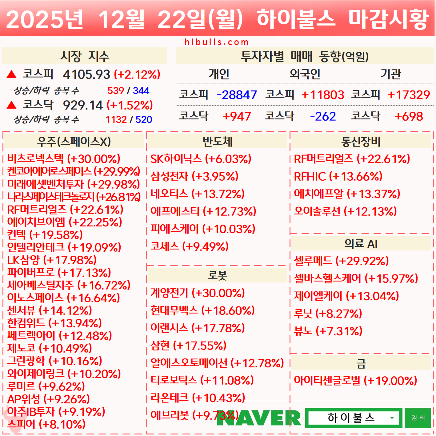 [12.22] 외국인/기관 순매수 상위 종목(우주, 반도체)