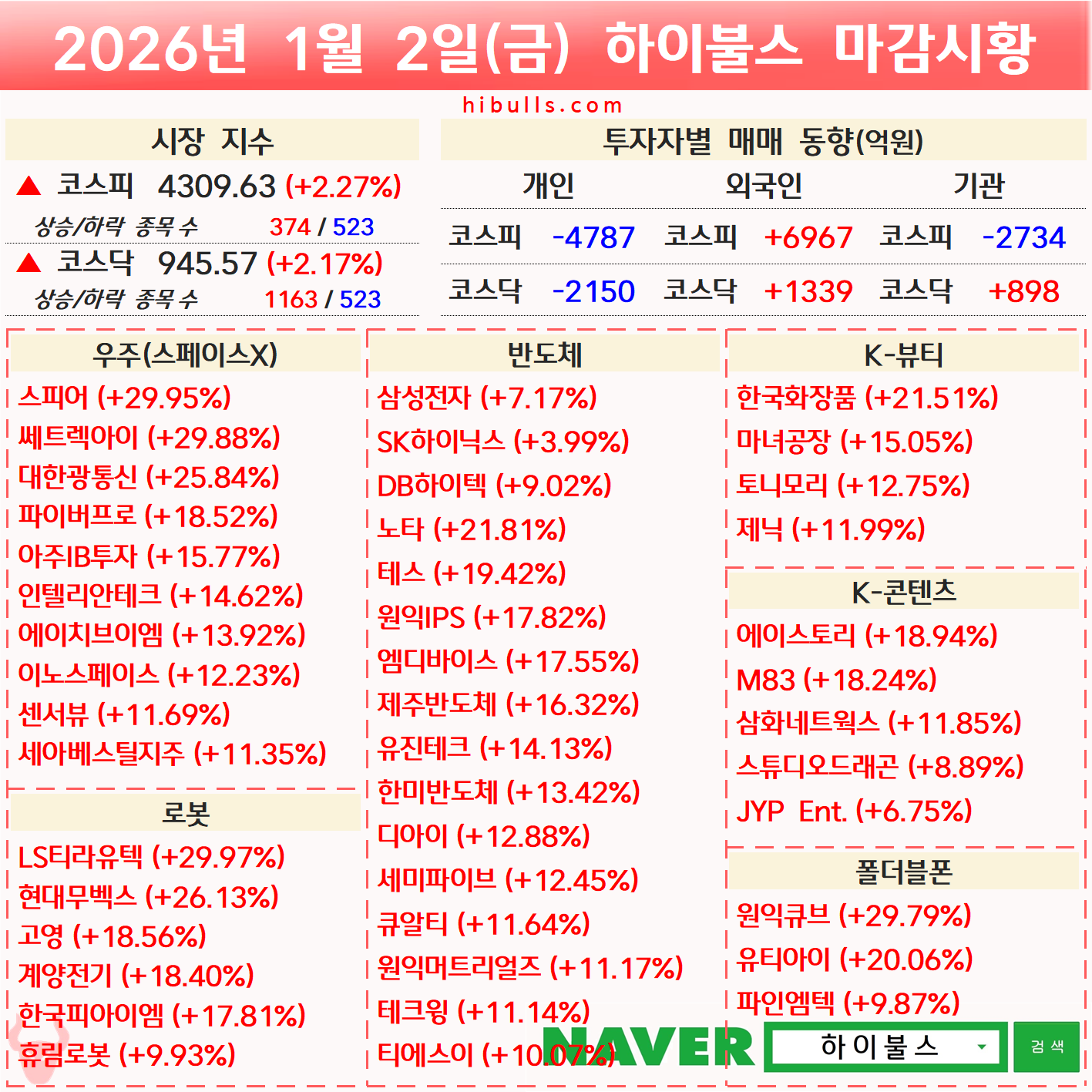 [01.02] 외국인/기관 순매수 상위 종목(반도체, 우주)