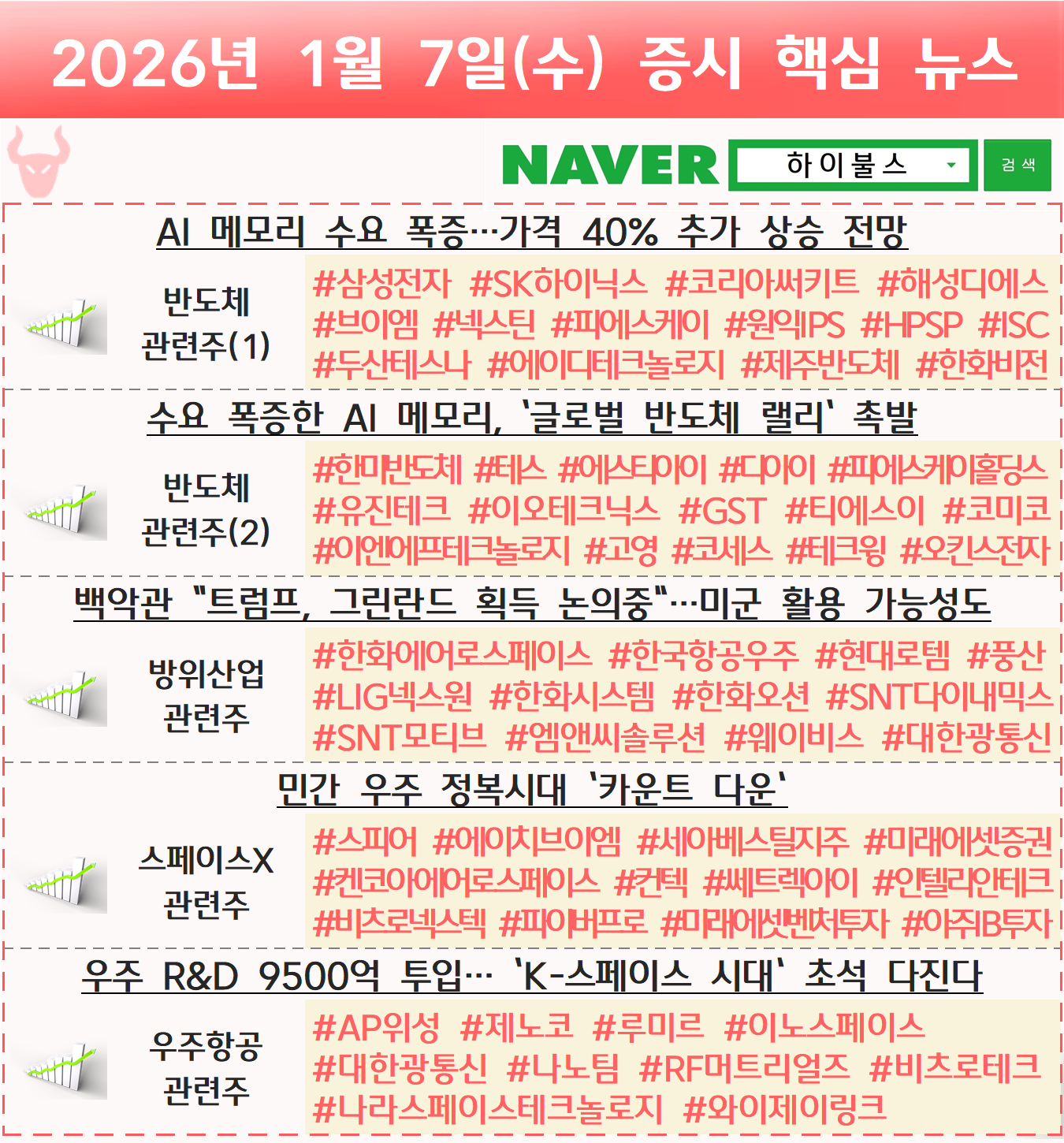 반도체 관련주, 방산 관련주, 방위산업 관련주, 전쟁 관련주, 스페이스X 관련주, 우주 관련주, 우주항공 관련주 글 내비게이션 [01.06] 증시 개장 전 핵심뉴스 하이불스 Pick [01.08] 증시 개장 전 핵심뉴스 하이불스 Pick
