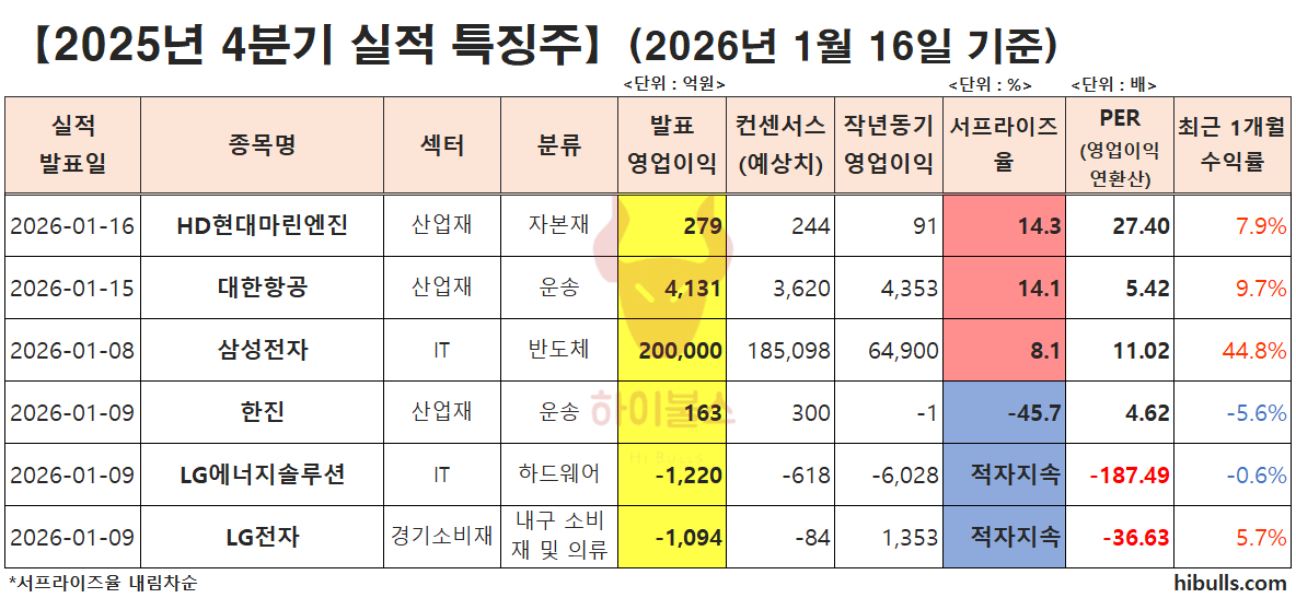 실적 서프라이즈 : 없음 실적 상회 : HD현대마린엔진, 대한항공, 삼성전자 실적 부합 : 없음 실적 미스 : 없음 실적 쇼크 : 한진, LG에너지솔루션, LG전자 글 내비게이션 [01.19] 증시 개장 전 시황&오늘의 대응 전략 [01.19] 종목별 증권사 투자의견 요약