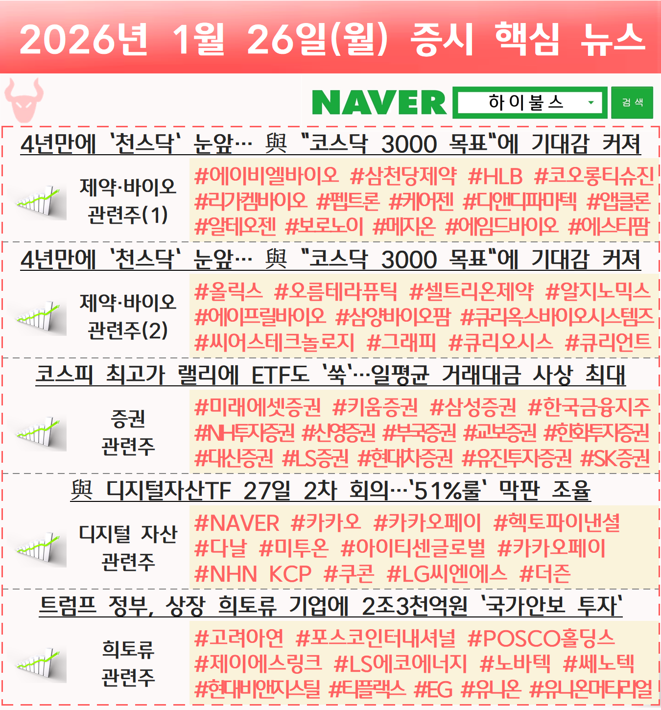 제약 바이오 관련주, 증권 관련주, 디지털자산 관련주, 디지털 자산 관련주, STO 관련주, 스테이블코인 관련주, 희토류 관련주 글 내비게이션 [01.23] 증시 개장 전 핵심뉴스 하이불스 Pick