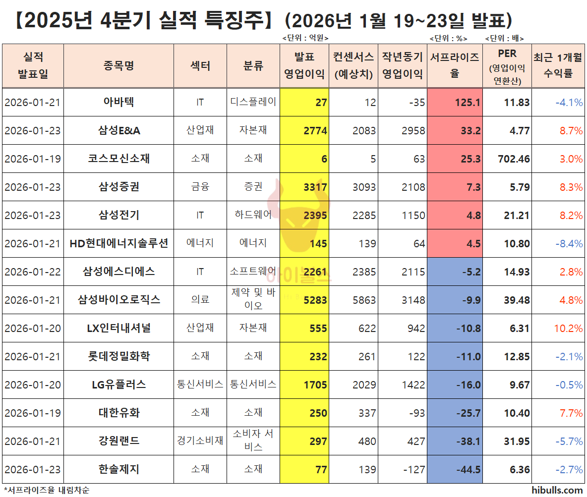 실적 서프라이즈 : 아바텍, 삼성E&A, 코스모신소재