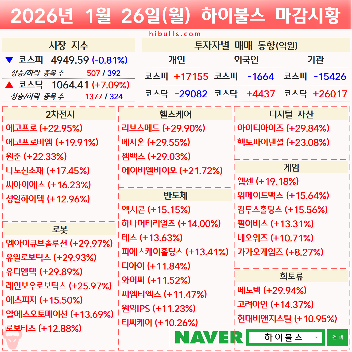 [01.26] 증시 마감시황 및 오늘의 특징주
