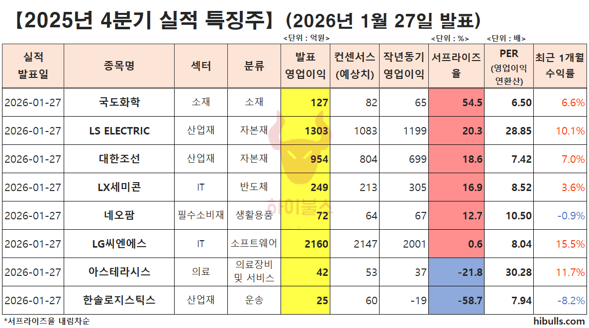 실적 서프라이즈 : 국도화학, LS ELECTRIC, 대한조선, LX세미콘 실적 상회 : 네오팜 실적 부합 : LG씨엔에스 실적 쇼크 : 아스테라시스, 한솔로지스틱스 글 내비게이션 [01.28] 증시 개장 전 시황&오늘의 대응 전략 [01.28] 종목별 증권사 투자의견 요약