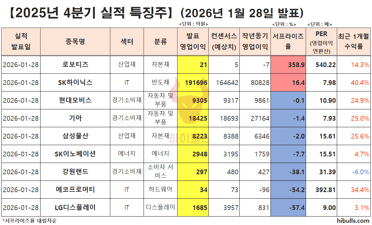 실적 서프라이즈 : 로보티즈, SK하이닉스 실적 부합 : 현대모비스, 기아, 삼성물산 실적 하회 : SK이노베이션 실적 쇼크 : 강원랜드, 에코프로머티, LG디스플레이 글 내비게이션 [01.29] 증시 개장 전 시황&오늘의 대응 전략 [01.29] 종목별 증권사 투자의견 요약