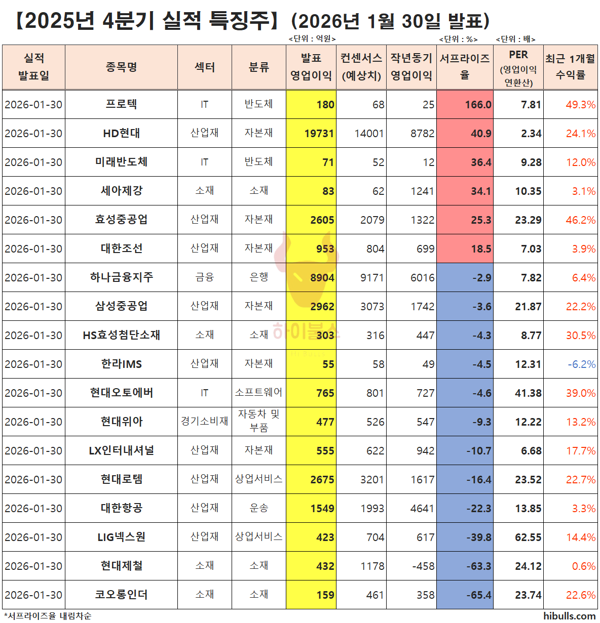 실적 서프라이즈 : 프로텍, HD현대, 미래반도체, 세아제강, 효성중공업, 대한조선