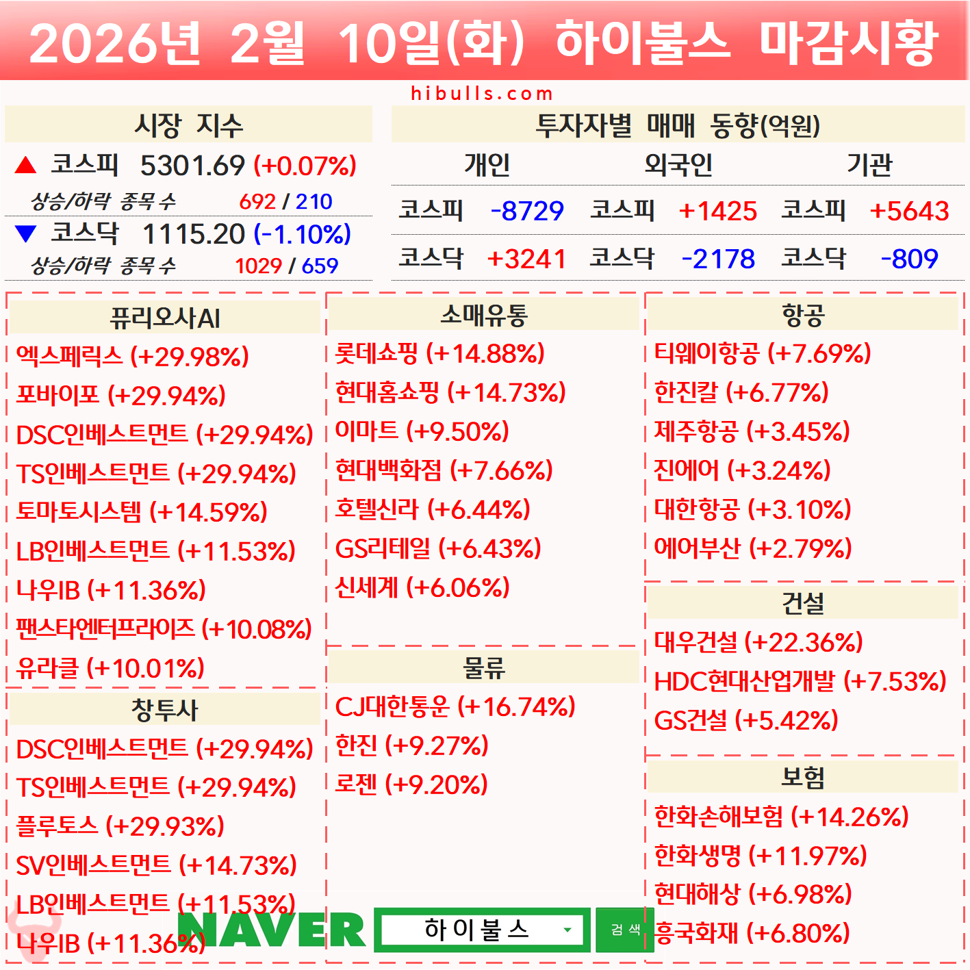 [02.10] 증시 마감시황 및 오늘의 특징주