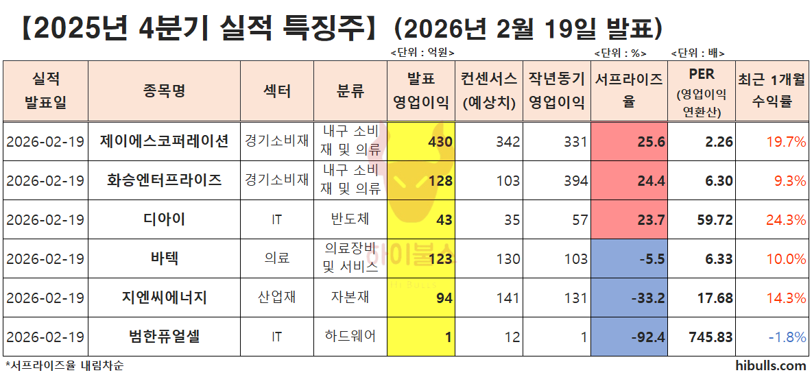 실적 서프라이즈 : 제이에스코퍼레이션, 화승엔터프라이즈, 디아이 실적 부합 : 바텍 실적 쇼크 : 지엔씨에너지, 범한퓨얼셀 글 내비게이션 [02.20] 증시 개장 전 시황&오늘의 대응 전략 [02.20] 종목별 증권사 투자의견 요약