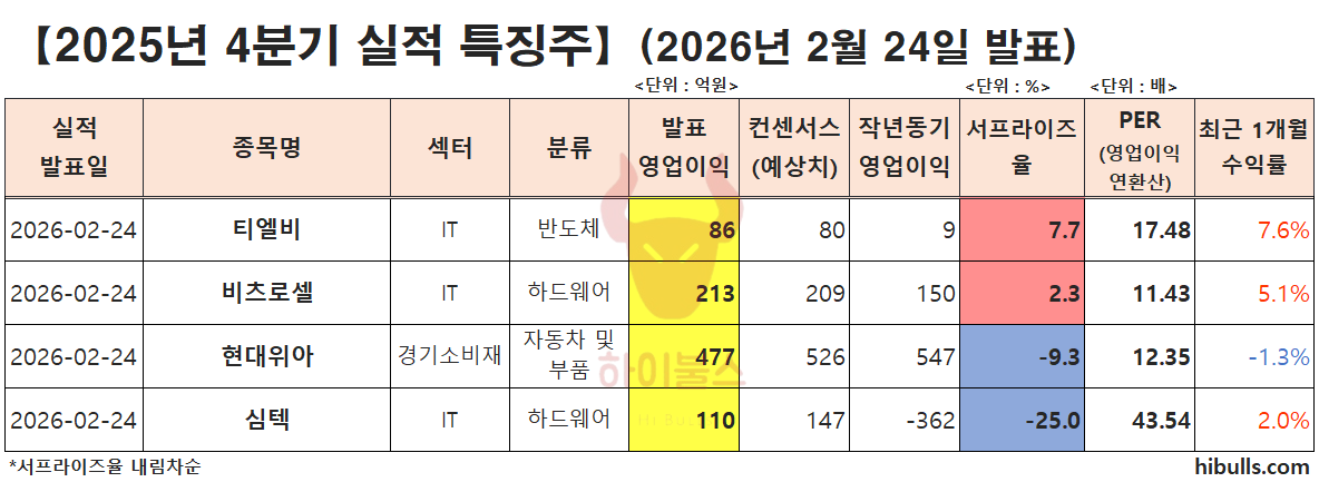 실적 상회 : 티엘비 실적 부합 : 비츠로셀 실적 하회 : 현대위아 실적 쇼크 : 심텍 글 내비게이션 [02.25] 증시 개장 전 시황&오늘의 대응 전략 [02.25] 종목별 증권사 투자의견 요약