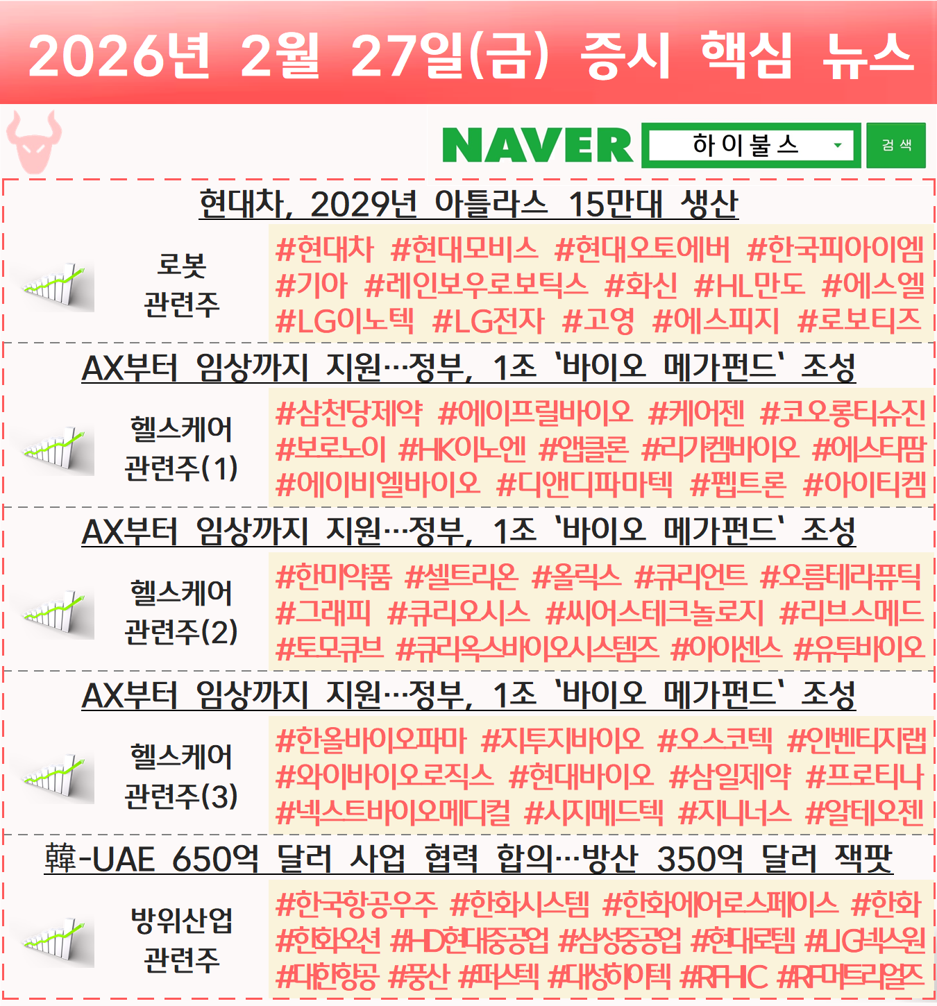로봇 관련주, 휴머노이드 관련주, 로보틱스 관련주, 피지컬 AI 관련주, 헬스케어 관련주, 제약 바이오 관련주, 방산 관련주, 방산주, 방위산업 관련주 글 내비게이션 [02.26] 증시 개장 전 핵심뉴스 하이불스 Pick