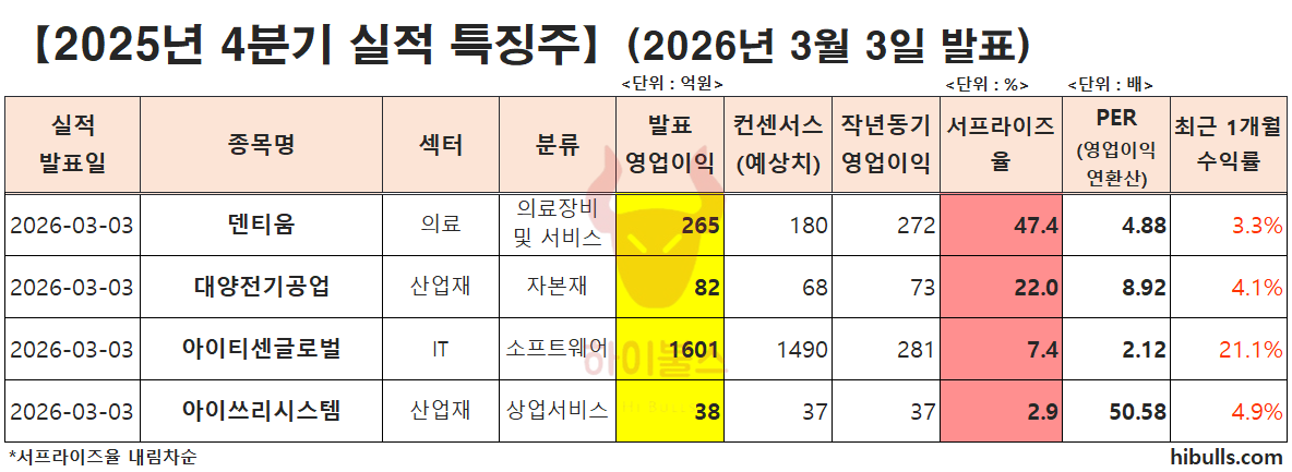 실적 서프라이즈 : 덴티움, 대양전기공업 실적 상회 : 아이티센글로벌 실적 부합 : 아이쓰리시스템 글 내비게이션 [03.04] 증시 개장 전 시황&오늘의 대응 전략 [03.04] 종목별 증권사 투자의견 요약