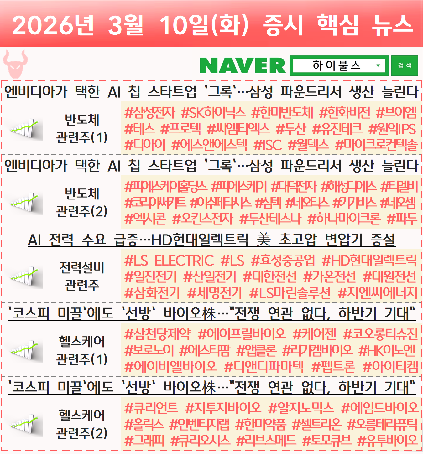 반도체 관련주, 전력설비 관련주, 전력망 관련주, 전력기기 관련주, 헬스케어 관련주, 제약 바이오 관련주