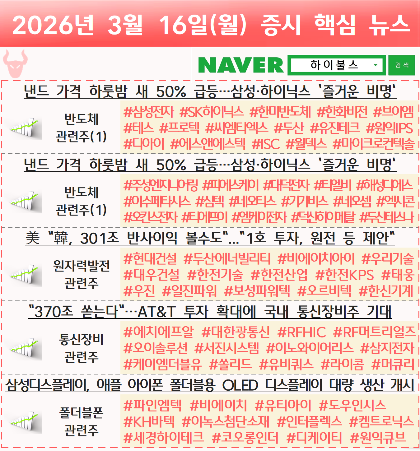 반도체 관련주, 원전 관련주, 원자력 관련주, 원자력발전 관련주, 원자력에너지 관련주, 원자력 에너지 관련주, 통신장비 관련주, 통신 관련주, 폴더블 관련주, 폴더블폰 관련주 글 내비게이션 [03.13] 증시 개장 전 핵심뉴스 하이불스 Pick