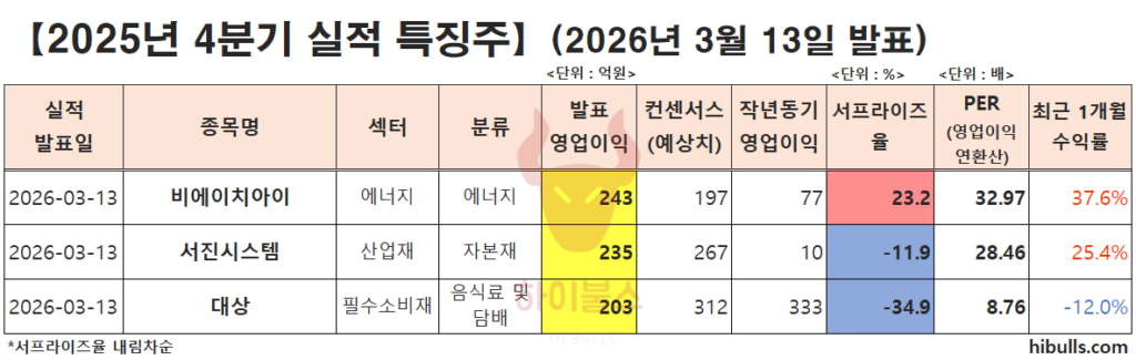 실적 서프라이즈 : 비에이치아이 실적 하회 : 서진시스템 실적 쇼크 : 대상 글 내비게이션 [03.16] 증시 개장 전 시황&오늘의 대응 전략 [03.16] 종목별 증권사 투자의견 요약