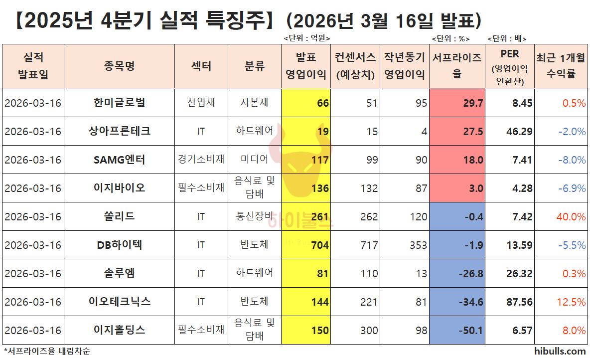 실적 서프라이즈 : 한미글로벌, 상아프론테크, SAMG엔터 실적 부합 : 이지바이오, 쏠리드, DB하이텍 실적 쇼크 : 솔루엠, 이오테크닉스, 이지홀딩스 글 내비게이션 [03.17] 증시 개장 전 시황&오늘의 대응 전략 [03.17] 종목별 증권사 투자의견 요약