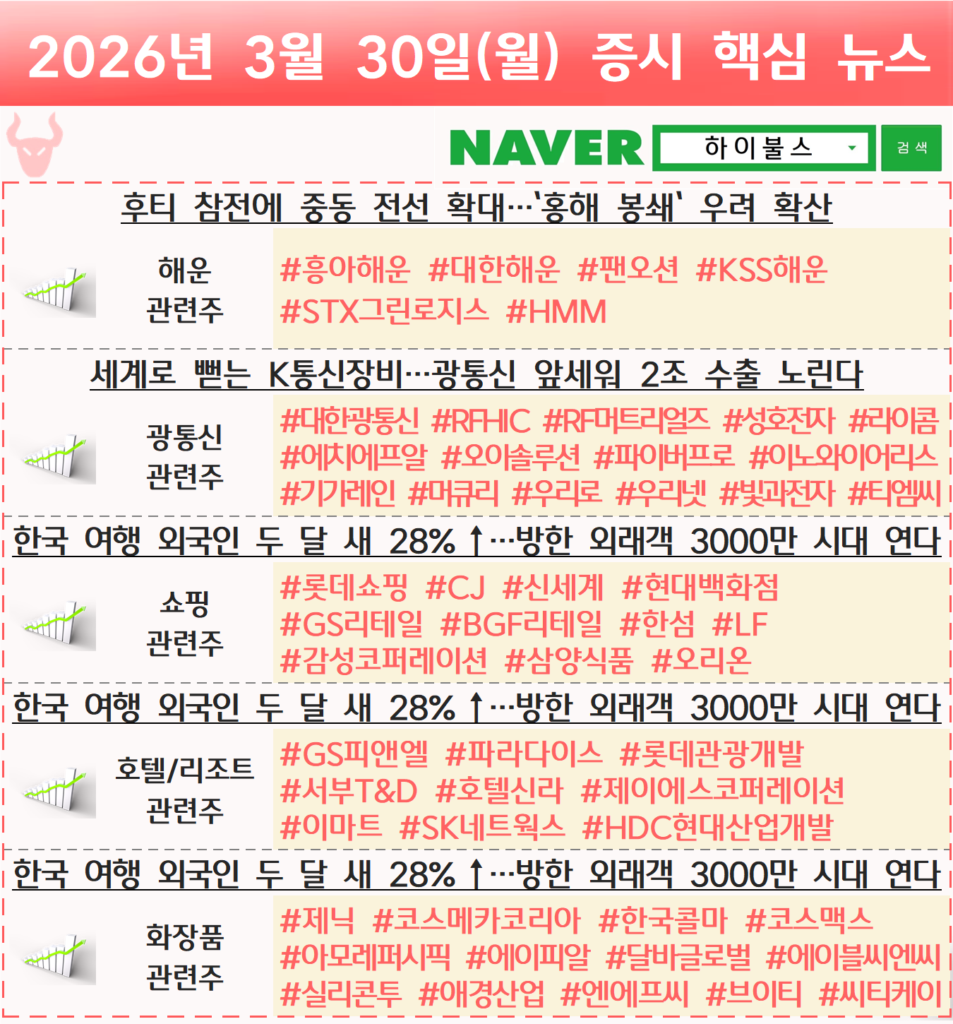 해운 관련주, 광통신 관련주, 통신장비 관련주, 쇼핑 관련주, 관광 관련주, 인바운드 소비 관련주, 인바운드 소비재 관련주, 호텔 관련주, 리조트 관련주, 화장품 관련주, K-뷰티 관련주, K뷰티 관련주
