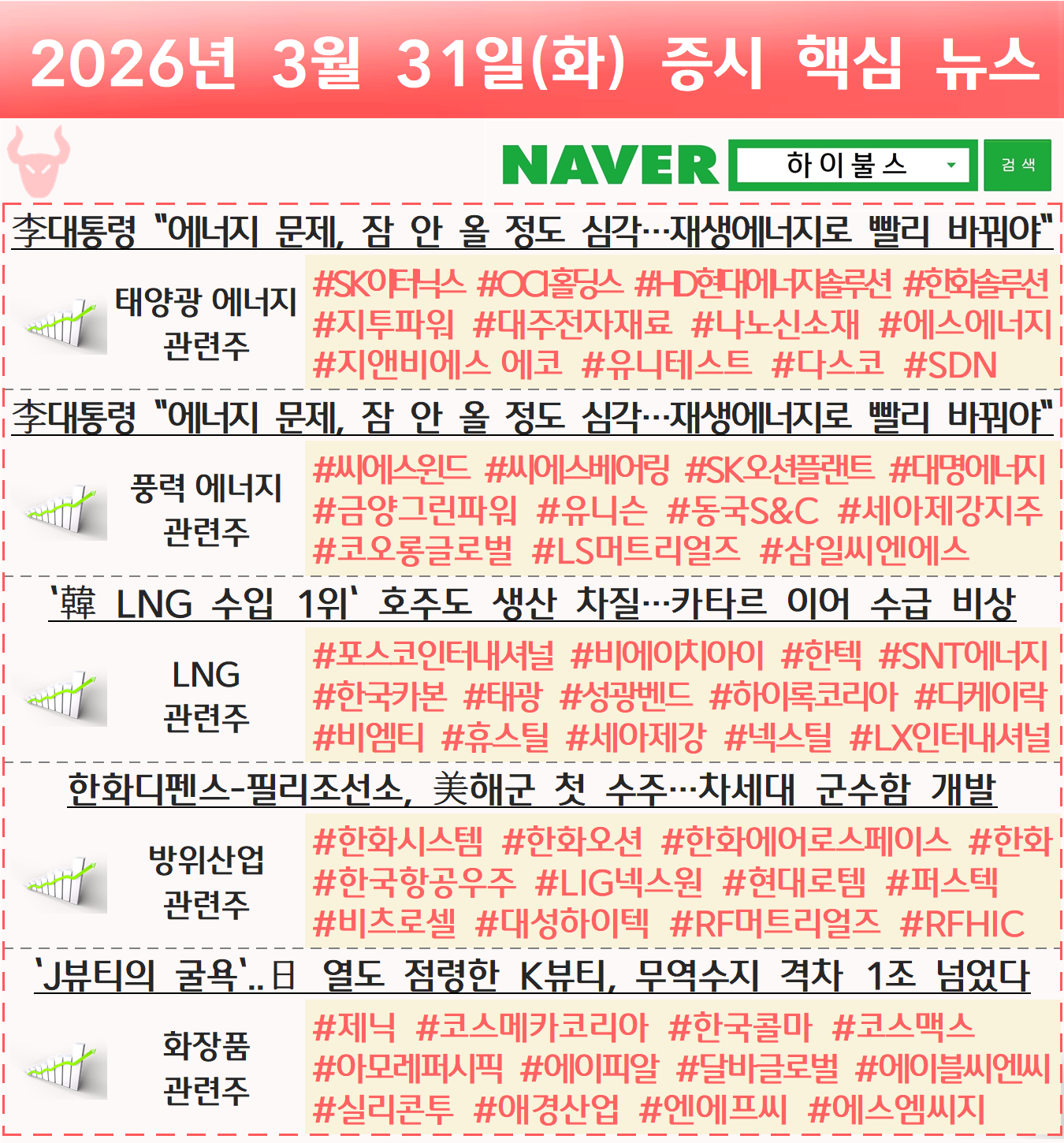 [03.31] 증시 개장 전 핵심뉴스 하이불스 Pick