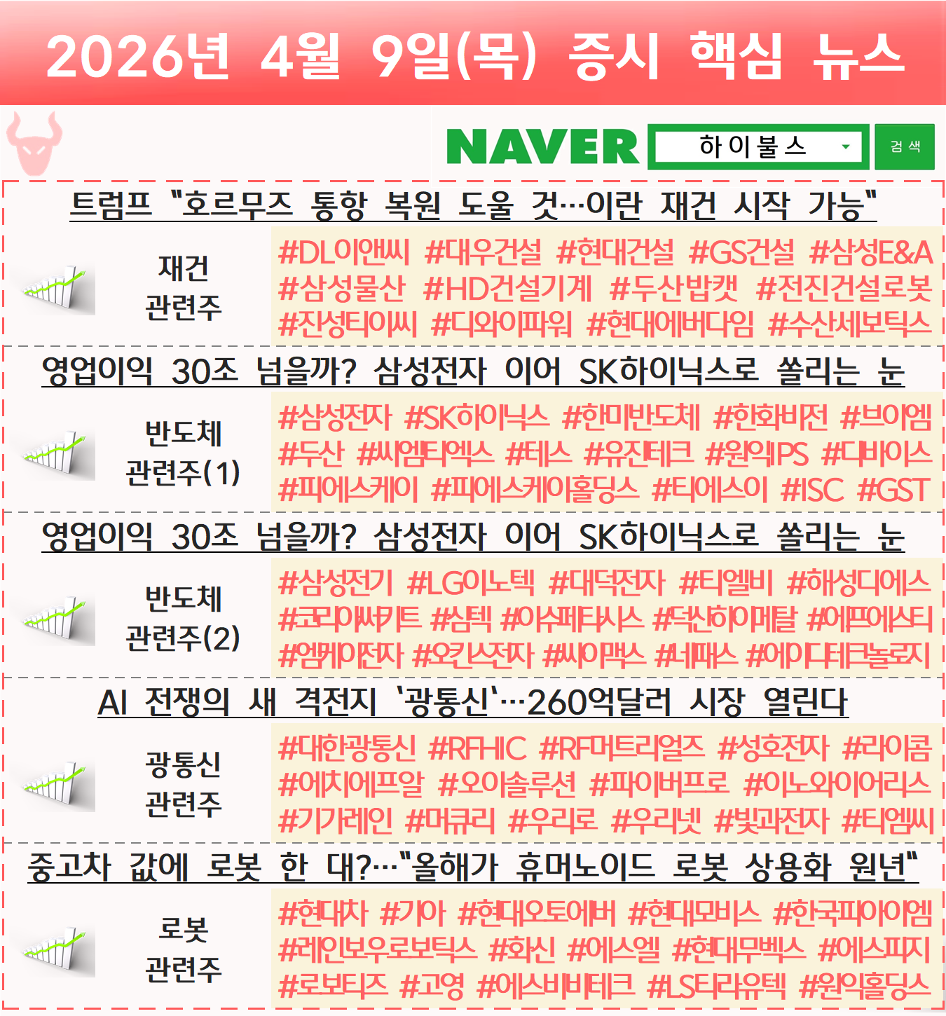재건 관련주, 종전 관련주, 휴전 관련주, 반도체 관련주, 광통신 관련주, 로봇 관련주, 휴머노이드 관련주, 피지컬AI 관련주 글 내비게이션 [04.08] 증시 개장 전 핵심뉴스 하이불스 Pick