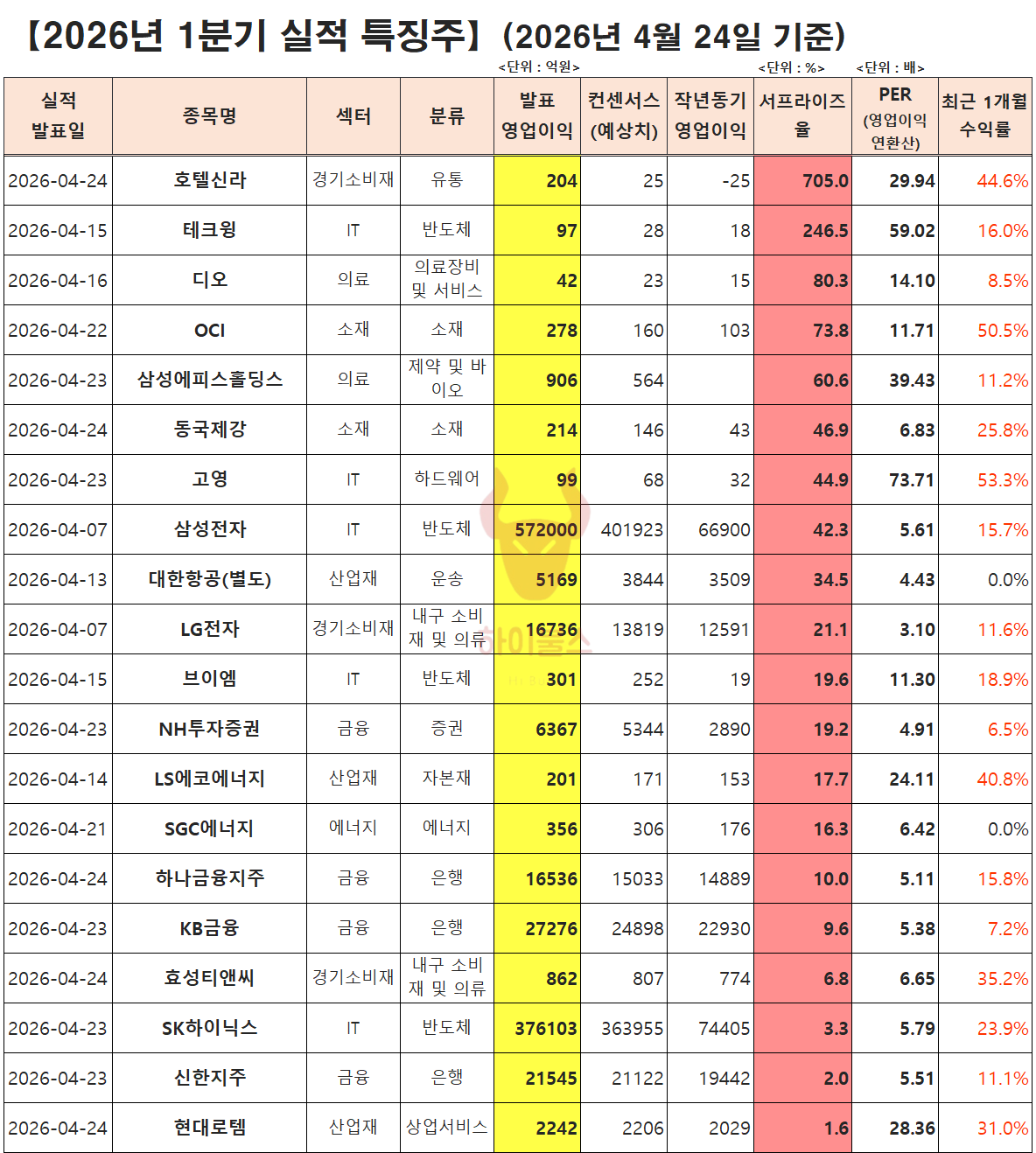 실적 서프라이즈 : 호텔신라, 테크윙, 디오, OCI, 삼성에피스홀딩스, 동국제강, 고영, 삼성전자, 대한항공, LG전자, 브이엠, NH투자증권, LS에코에너지, SGC에너지