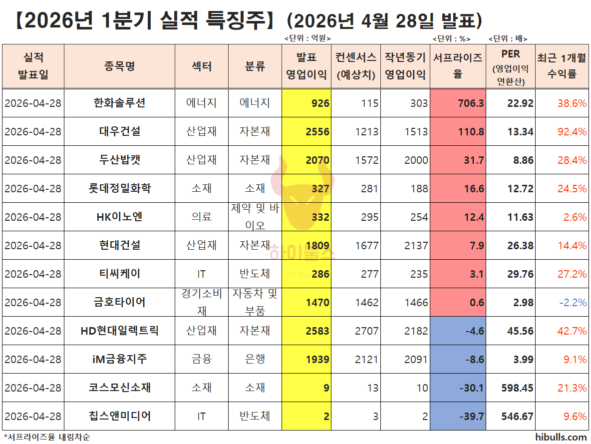 실적 서프라이즈 : 한화솔루션, 대우건설, 두산밥캣, 롯데정밀화학